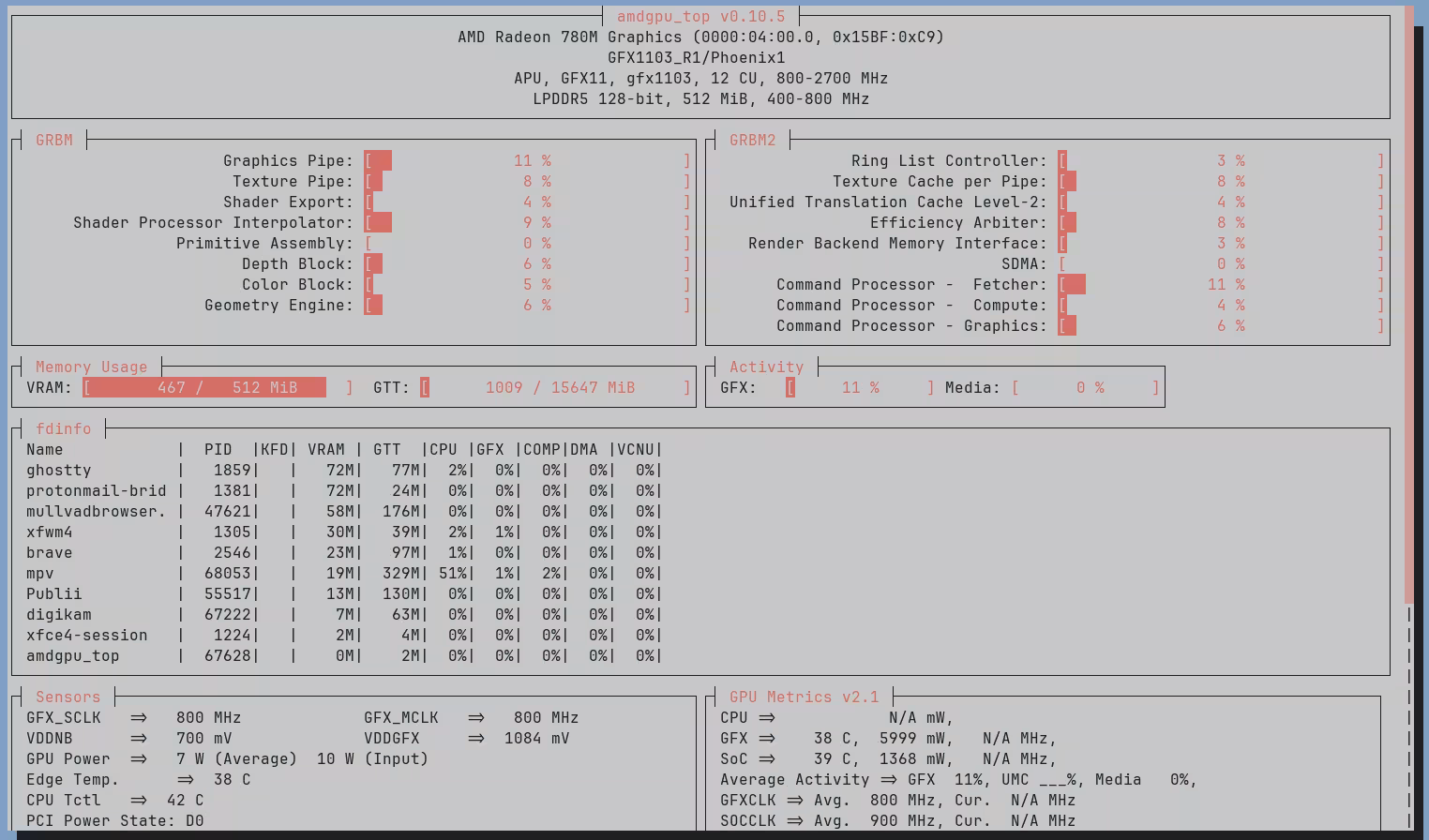 First, I started down the path of using the embedded 780M Radeon GPU that's part of the Ryzen 7/9 SOC. Here's what amdgpu_top command looks like on an idle system: