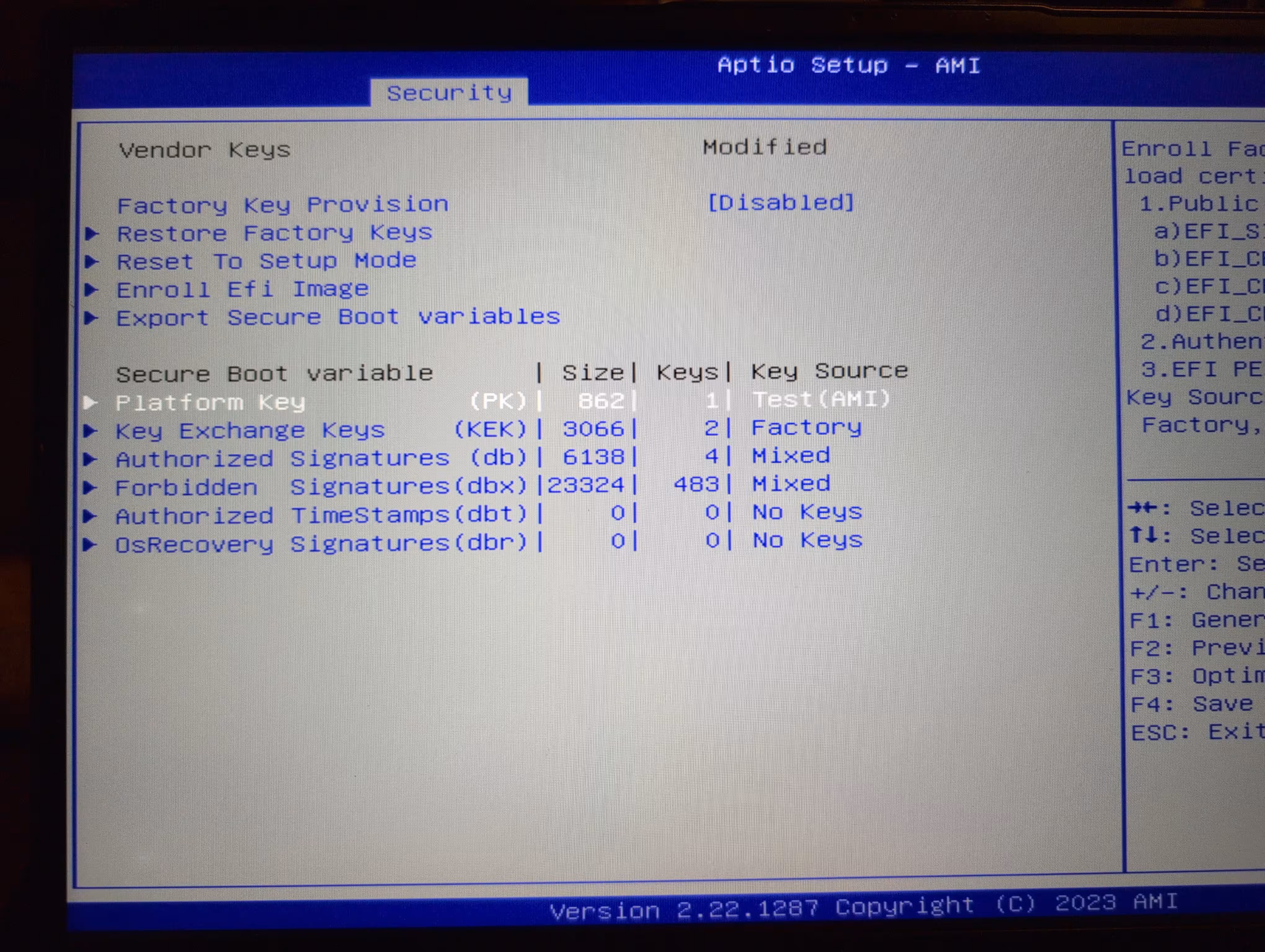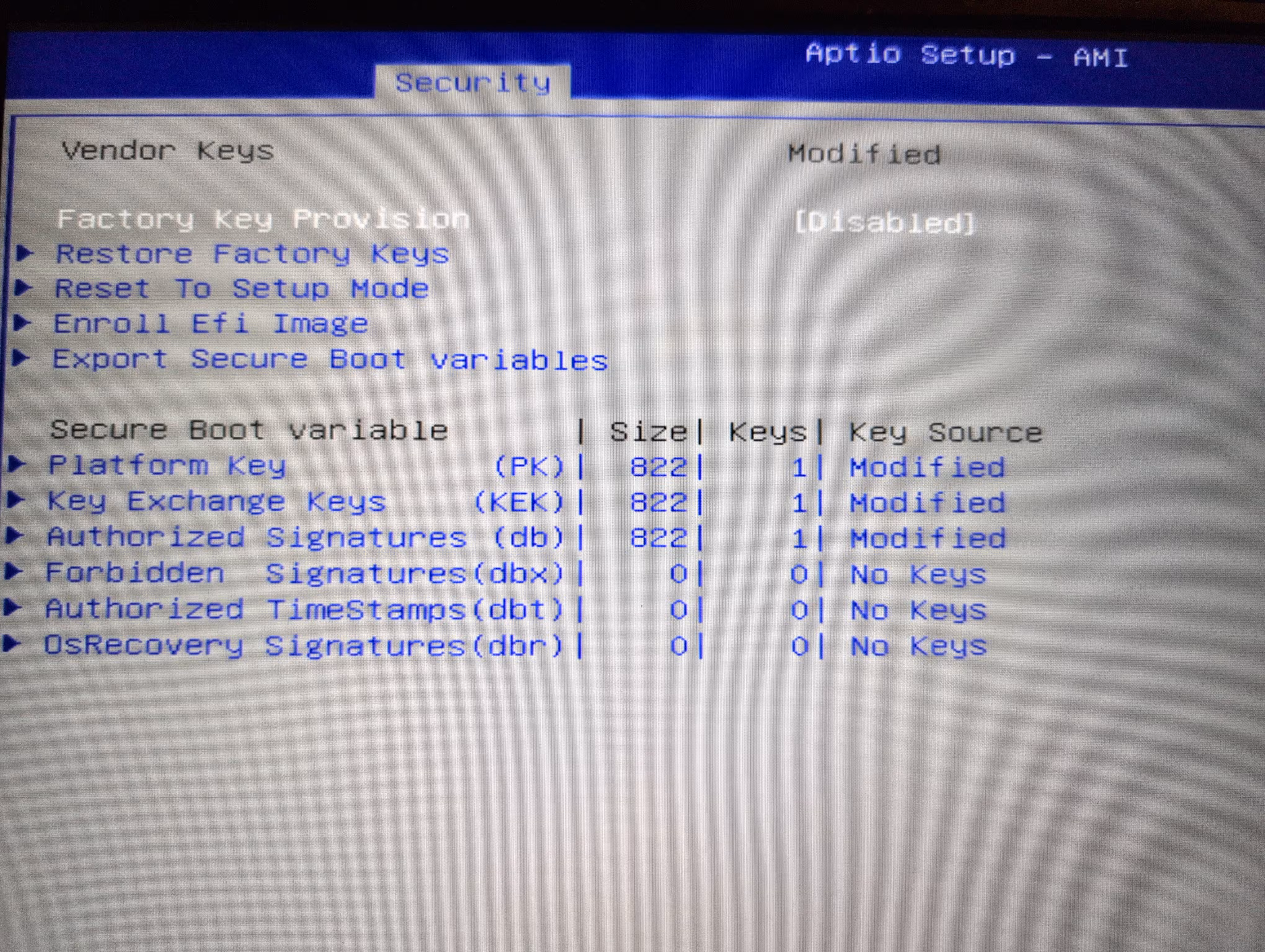 The "secure boot" is tied to a Platform Key. This is the root of trust for everything afterwards. We have the Platform Key with a key source of "Test (AMI)". Ugh, horrible. The factory Key Exchange Keys (KEK) are set at the factory. The db and dbx are updated for banned/blocked/allowed signatures tied to the PK and KEK, roughly. Fundamentally, the db/dbx updates are signed by Microsoft who gets final say in what's included. My goal is to get rid of this dependency because I can and should.
