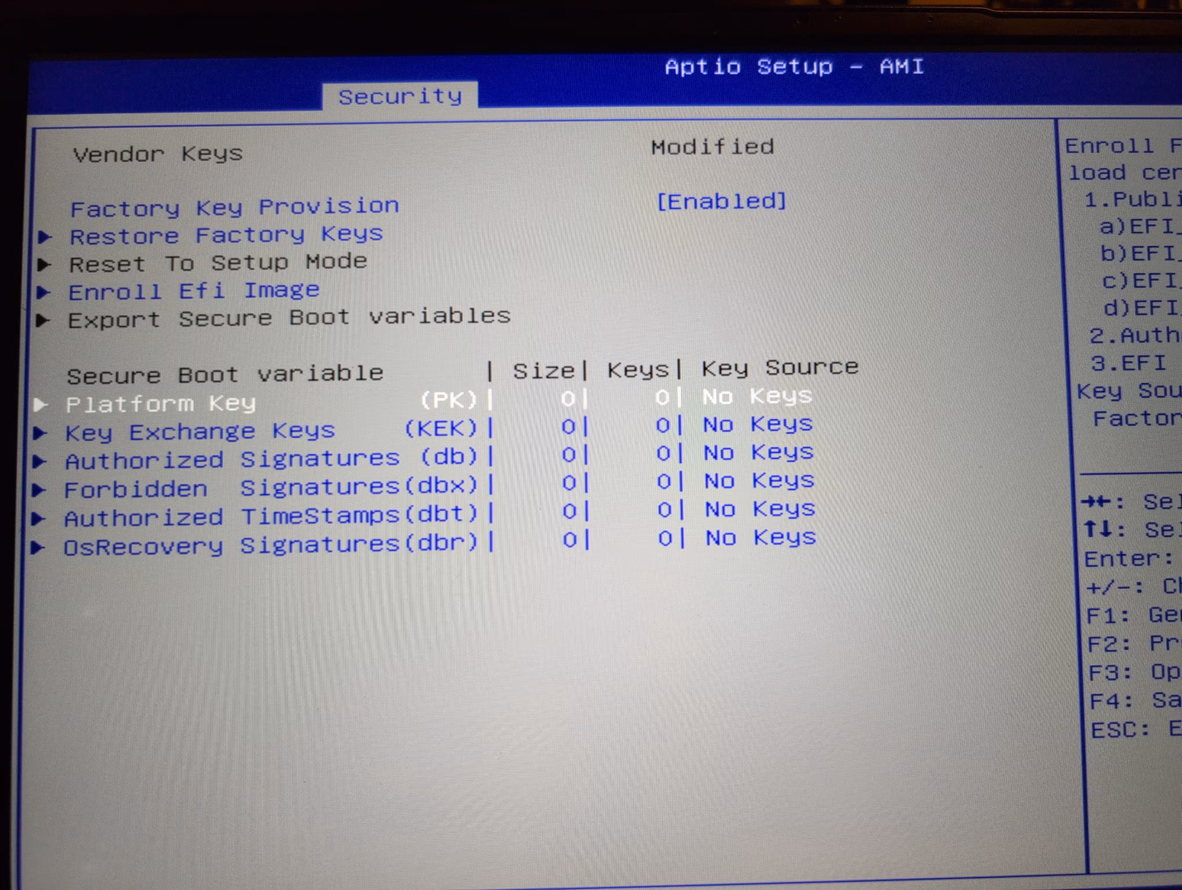 Today, we're going to focus on the secure boot with UEFI on linux with my laptop. First off, we dove into the UEFI firmware to see if we can wipe the default/manufacturer Platform Keys. The original concept comes from Microsoft as a way to make people think Windows can be secure; hence the marketing name, secure boot. This also assumed Microsoft would control the keys and only allow what they want. Fortunately, this is not the case.