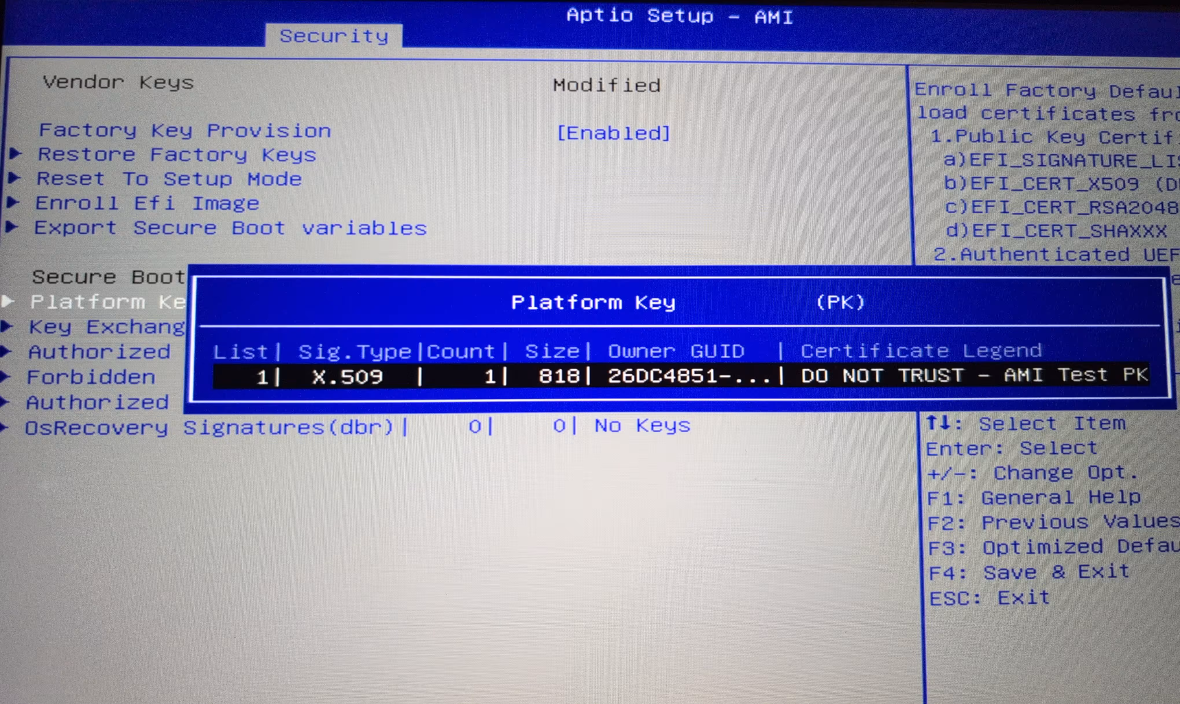 Notice the Certificate Legend. Sigh. Now you know why I want to generate and install my own Platform Key. Unfortunately, this test PK situation is rather common. Luckily, this system let's me wipe the keys and start with my own.